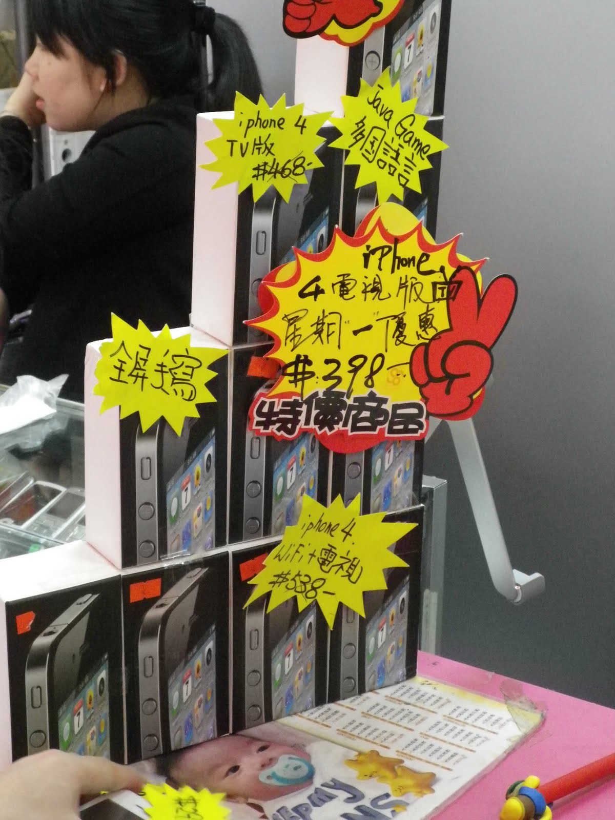 Ahí lo pone bien claro, iPhone 4 por HK$398 (unos 35€). Y diréis: Cómooooo??? Pues sí, y además, según dice, tiene Wifi, Tv y juegos en Java, además de lo que pone en Chino que todavía no entiendo. Las cajas son casi iguales que las de los iPhones de verdad, y el precio ya me diréis, un iPhone real vale unos HK$4900, el más barato...